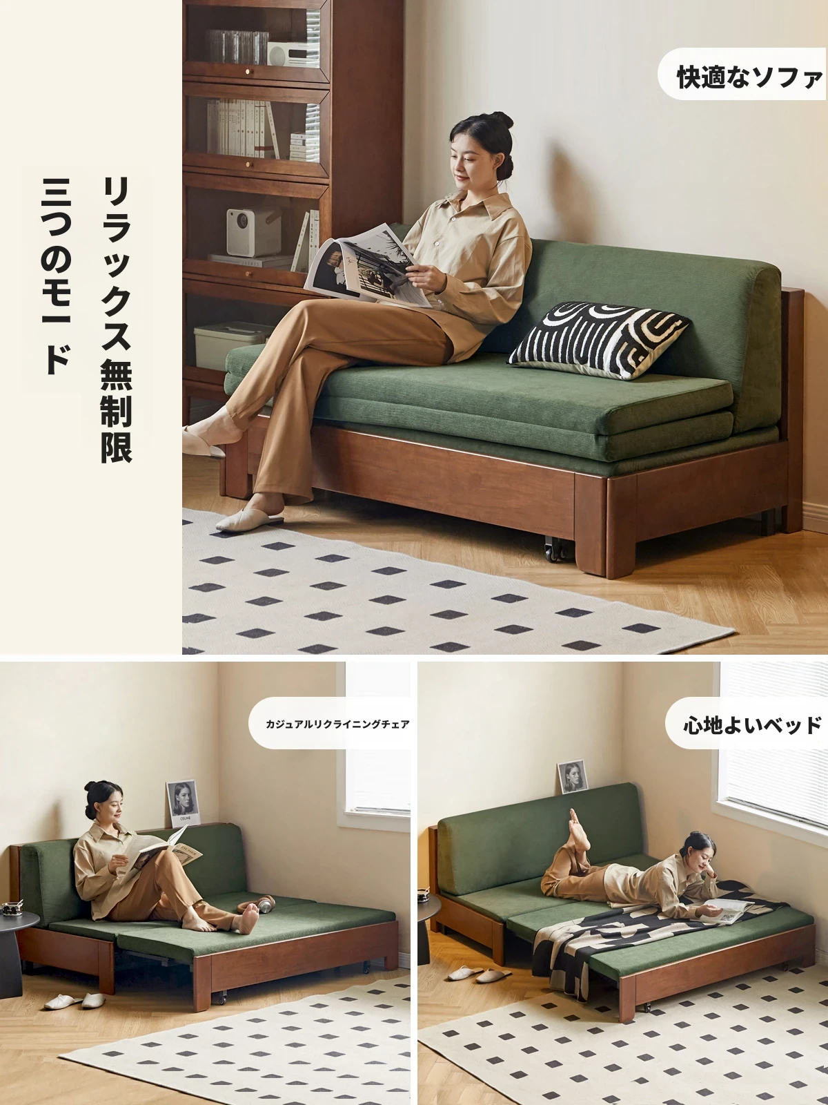 源氏木语x维莎の天然木製ソファベッド - 小型スペースに最適! 折りたたみ式でソファとベッドの二役を果たし、リビングにぴったりの機能的なデザイン。快適な使い心地をぜひお試しください!