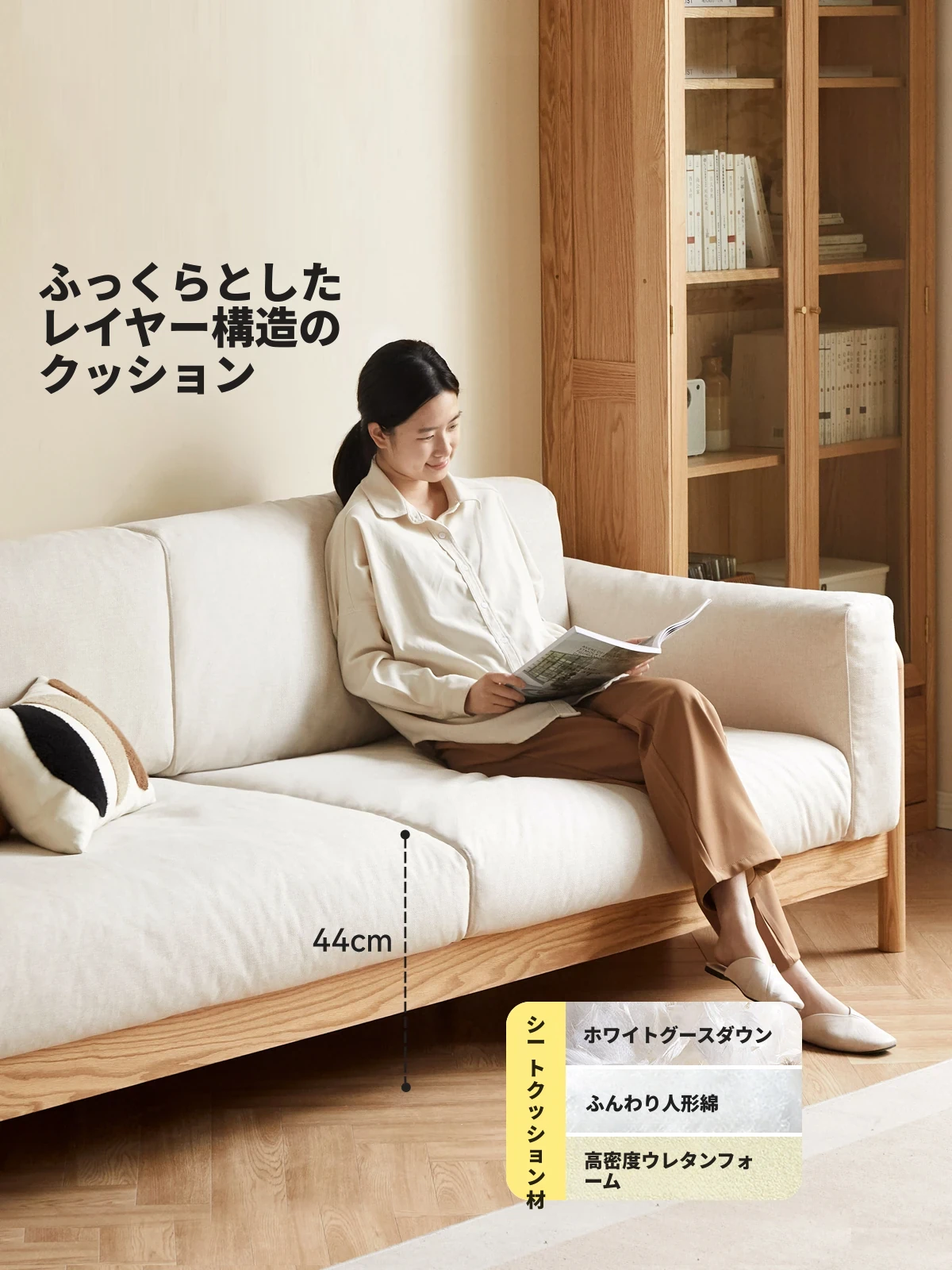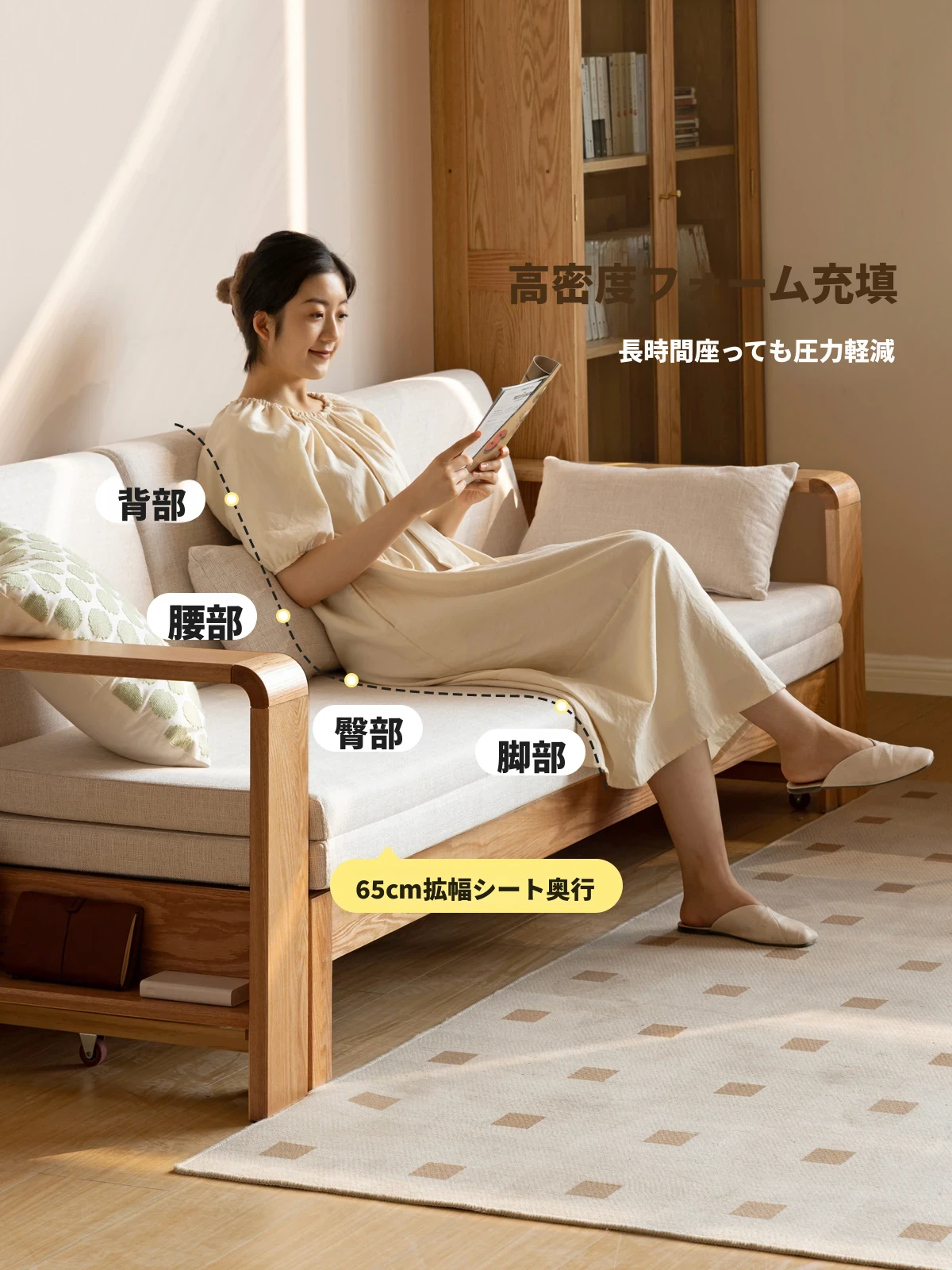 【希少な木製デザイン】源氏木语×维莎本格天然木クリーム風ソファ - コンパクトサイズで小さなリビングにもぴったり!深みのある座り心地、魅力的な布張りソファ
