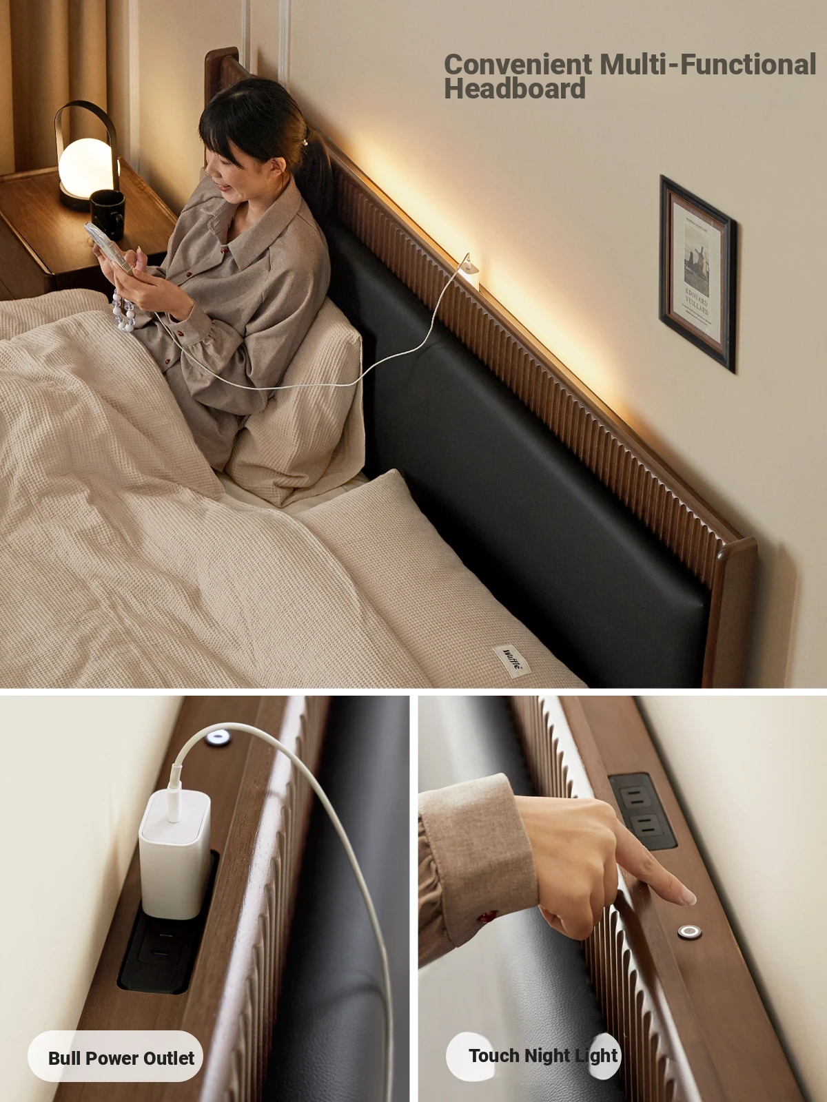 Vintage Walnut Finish Solid Wood Bed with Cat-Scratch Resistant Upholstery and Built-in LED Lights - Perfect for Master Bedroom