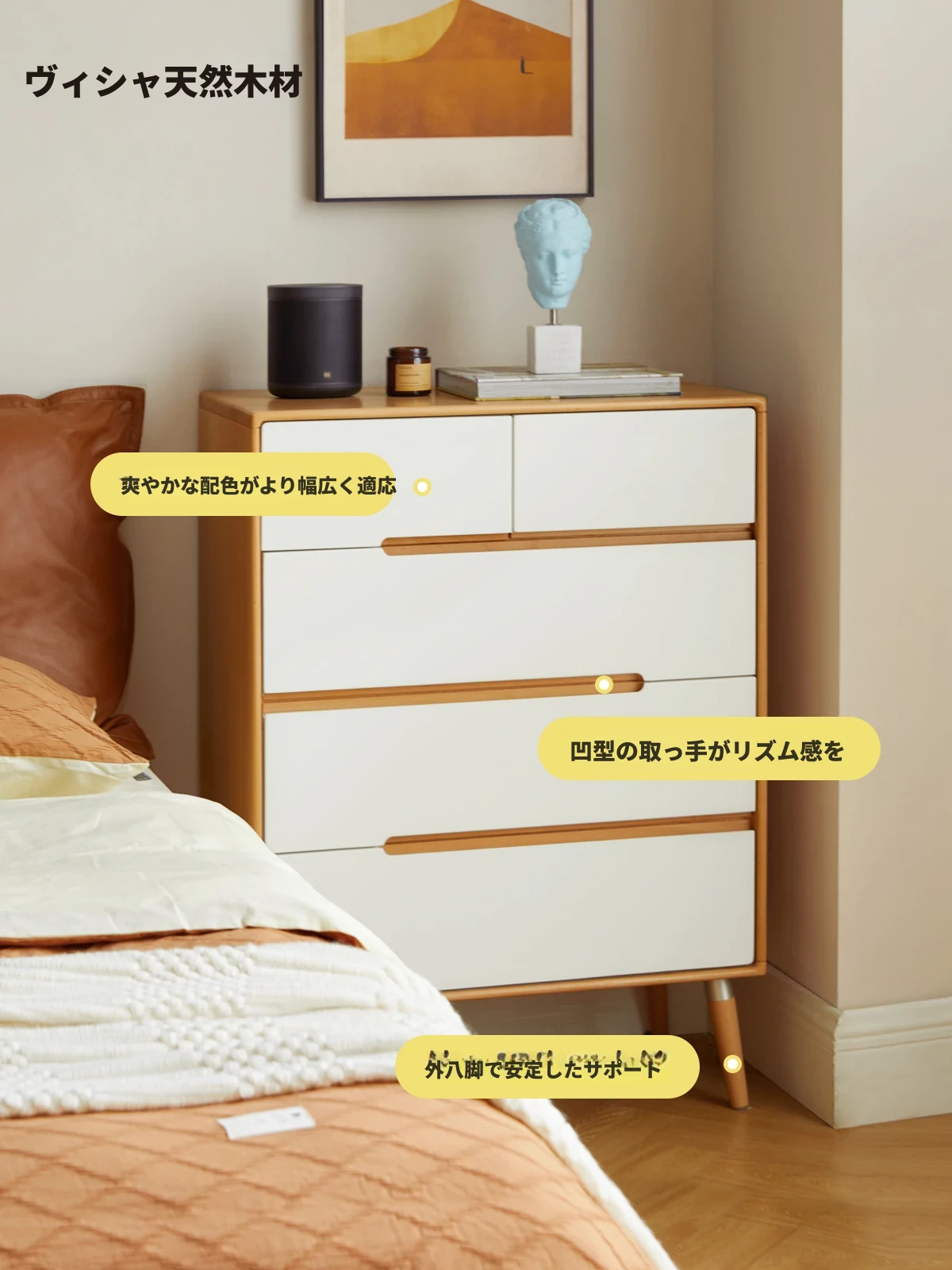 北欧風のオシャレで多機能なヴィサのホワイト無垢材チェスト - スタイリッシュな収納ソリューション